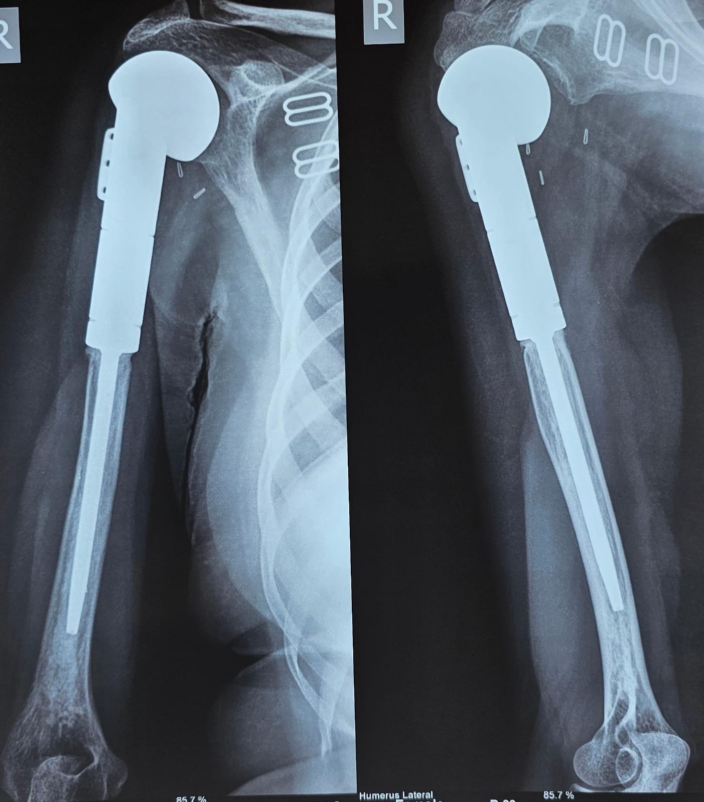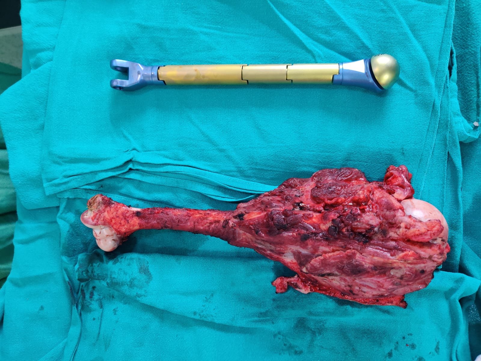 A rare surgery to achieve limb salvage surgery. This involves replacement of shoulder and elbow joint along with total humerus body.